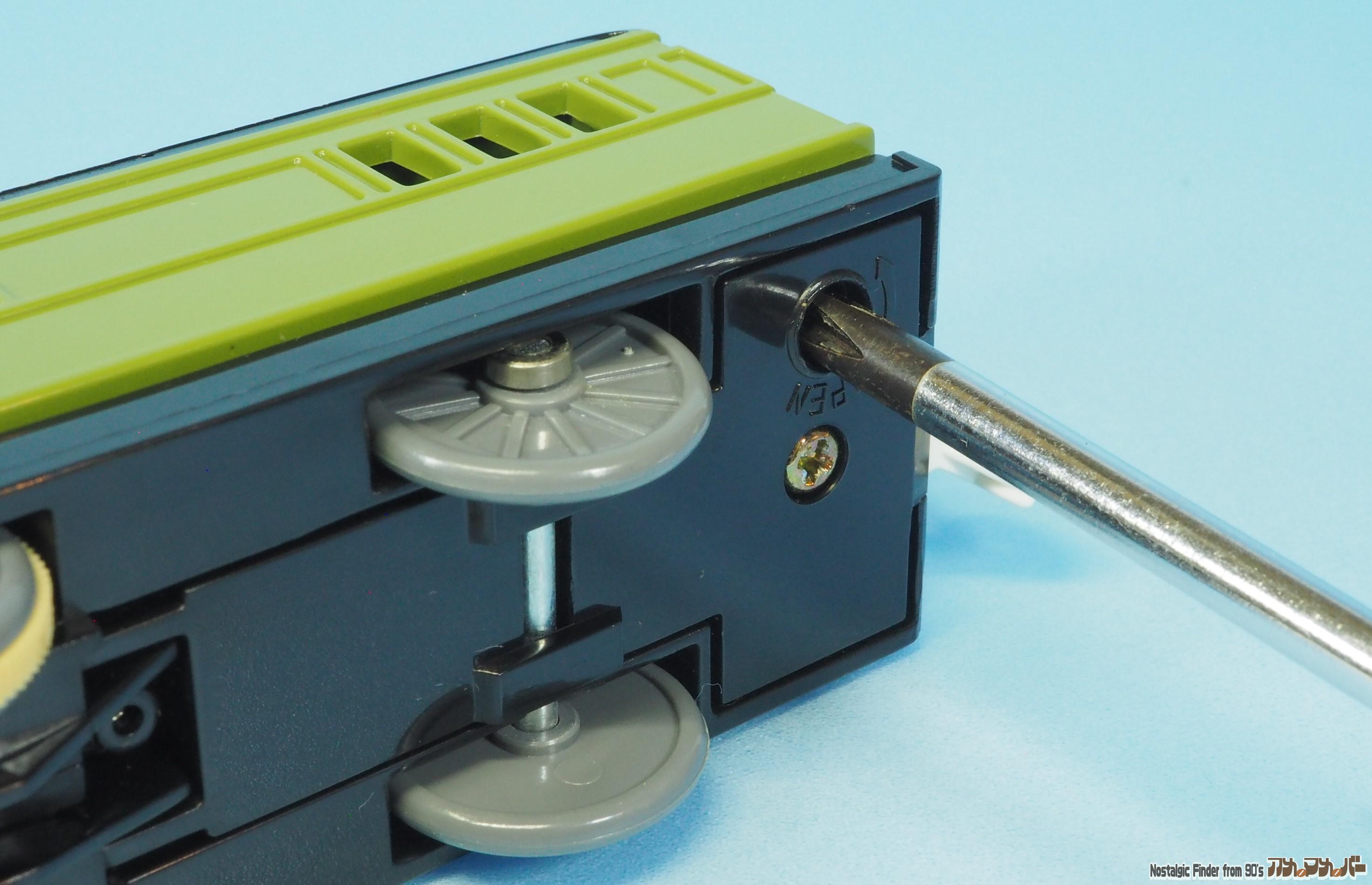 先頭車の下部にあるネジで電池蓋(シャーシ)は止まっています。